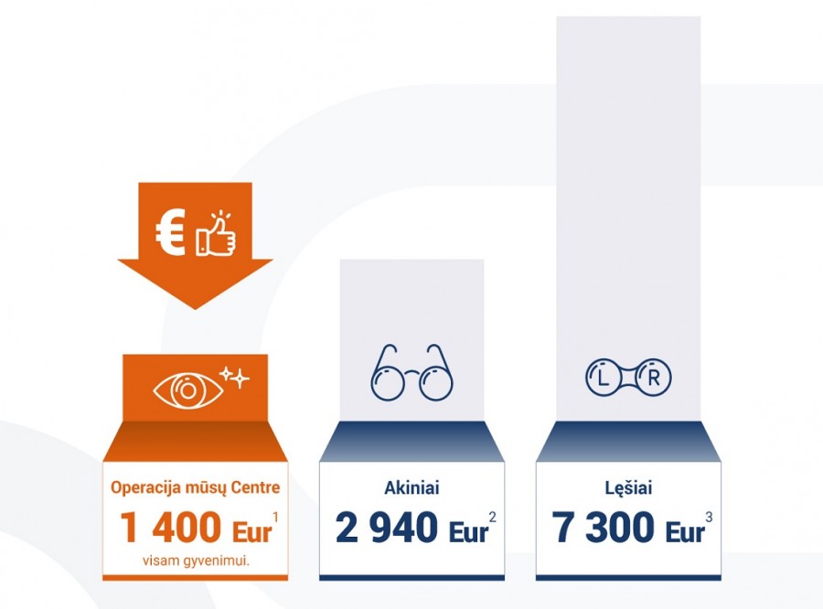 - Mūsų centro akių gydytojų patirtis rodo, kad akiniai keičiami ir konsultacija bei akių tyrimai atliekami vid. kas du metus, taigi tikėtinos išlaidos 2 940 Eur/15 metų.