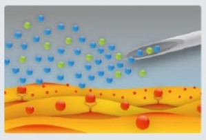 Протеин, подавляющий симптомы артроза, подсоединяется к рецепторам соответствующих внутренним кожным клеткам хряща и сустава, и таким образом эти клетки предохраняются от воздействия вредных протеинов (отмечено красным).